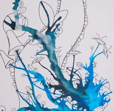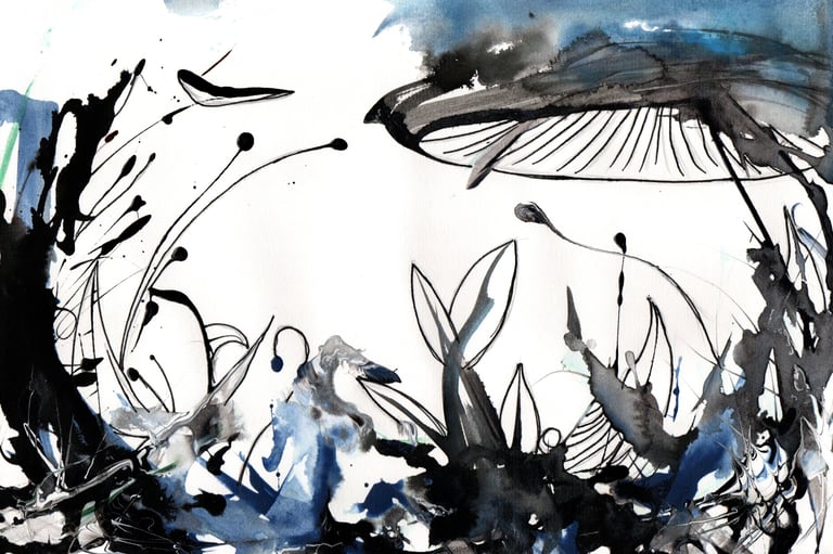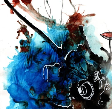 Once I began my new technique which was inspired by John Beckley (French artist on YouTube). He has a technique at the end of some of his artwork of mixing a little water or gloss medium into black and white acrylic paint so it flows well and squirting it using squeezy bottles... cool eh? So I gave it a go and after much experimenting was using different colours and spreading it using a silicone spreader, spraying water on it, dripping ink, blowing it, then using the black and white at the end in arcs or circles.
